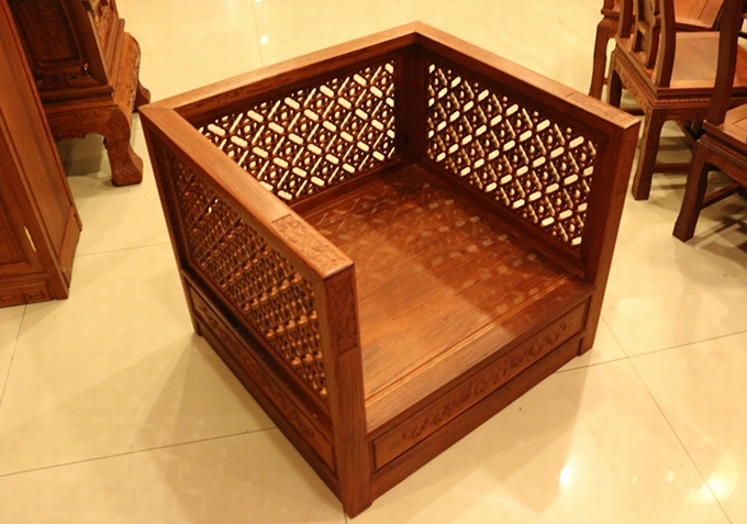 單人座沙發(fā)外觀方正匡整,兩邊扶手的高度設(shè)計的與靠背同高,而在其內(nèi)外兩側(cè)均雕繪有幅闌的鏤空幾何紋飾作為點綴,彰顯著浮美淡雅的中國風(fēng)式含蓄美。在沙發(fā)實際使用時,配上軟墊之后的坐感也更覺舒適,沙發(fā)座腳處地設(shè)計顯得地較為獨特,也可以說它已經(jīng)將座腳處設(shè)計的概念完全融入了沙發(fā)整體,以之整體式的箱體結(jié)構(gòu)作為座腳,更覺敦實、小巧玲瓏,頗有些許歐派家具式風(fēng)格的韻味,實為別致。